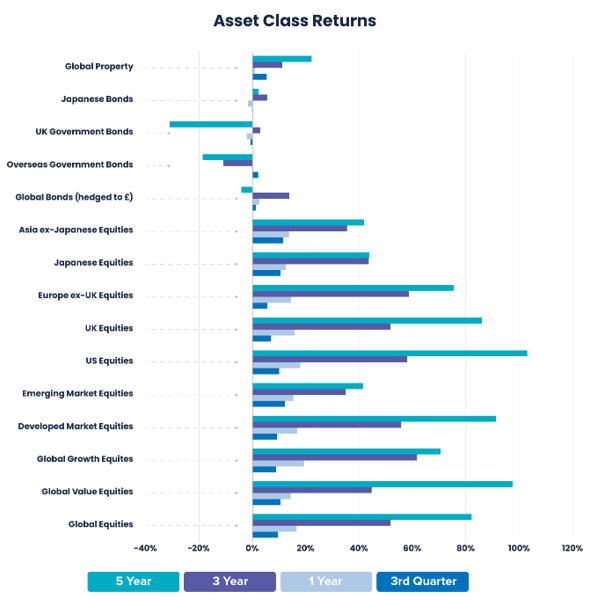Proxies: Asia ex-Japanese Equities: Morningstar Asia Pacific ex-Japan Large-Mid Cap GR GBP; Developed Market Equities: Developed Market Equities: Morningstar Developed Markets Target Market Exposure GR GBP; Emerging Market Equities: Emerging Market Equities: Morningstar Emerging Markets Target Market Exposure GR GBP; Europe ex-UK Equities: Europe ex UK Equities: Morningstar Developed Europe Target Market Exposure GR GBP; Global Bonds: Global Bonds: Vanguard Global Bond Index Hedged Acc GBP in GB; Global Corporate Bonds (hedged £): Vanguard Global Bond Index Hedged Acc GBP in GB: Global Equities: Global Equities: Morningstar Global Markets GR GBP; Global Growth Equites: Global Growth Equites: Morningstar Global Growth Target Market Exposure GR GBP; Global Property: Global Property: Morningstar Global Real Estate GR GBP; Global Value Equities: Global Value Equities: Morningstar Global Value Target Market Exposure GR GBP; Japanese Bonds: Japanese Bonds: Morningstar Japan Treasury Bond TR GBP Hedged; Japanese Equities: Japanese Equities: Morningstar Japan GR GBP; Overseas Government Bonds: Overseas Government Bonds: iShares Overseas Government Bond Index (UK) D Acc in GB; UK Equities: UK Equities: Morningstar UK GR GBP; UK Government Bonds: Vanguard UK Government Bond Index Acc GBP in GB; US Equities: US Equities: Morningstar US Target Market Exposure TR GBP. Performance periods: 3rd Quarter: 30/06/2025 – 30/09/2025, Year: 30/09/2024 – 30/09/2025; 3 Year: 30/09/2022 – 30/09/2025, 5 Year: 30/09/2020 – 30/09/2025.