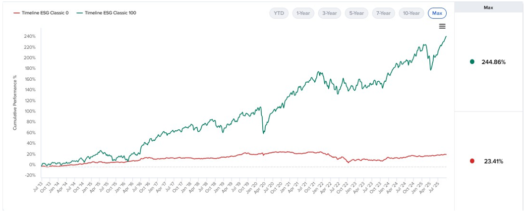 © Timeline Holdings Ltd 2025: All data is up to the latest available price. Past performance is no guarantee of future return. The data is sourced from Morningstar API, for which we are not responsible. Where Morningstar may have missing data or inaccurate data, we are not responsible. Careful consideration has been taken to ensure that the information is correct, but it neither warrants, represents nor guarantees the contents of the information, nor does it accept any responsibility for errors, inaccuracies, omissions or any inconsistencies herein. Percentages may not total 100 due to rounding.