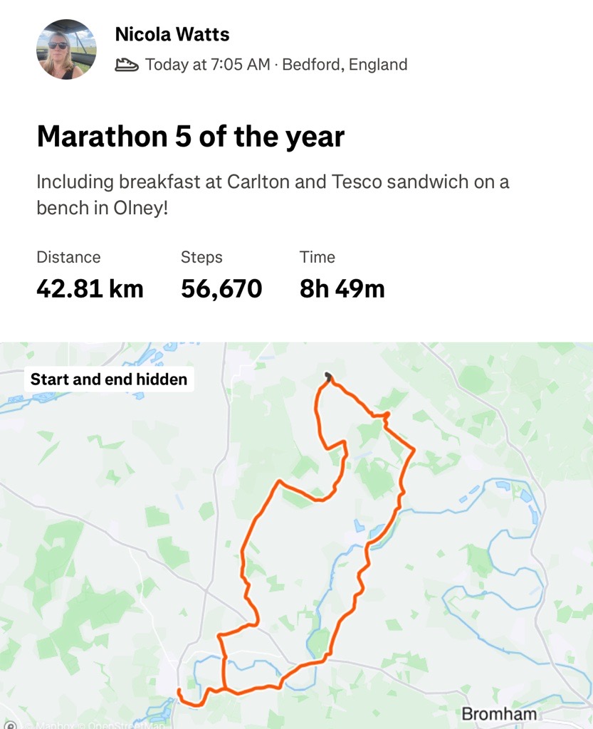 In May, Nicola stayed a little closer to home and completed a circuit around Jane Smith HQ, including breakfast with her parents in Carlton and lunch of a Tesco sandwich on a bench in Olney!